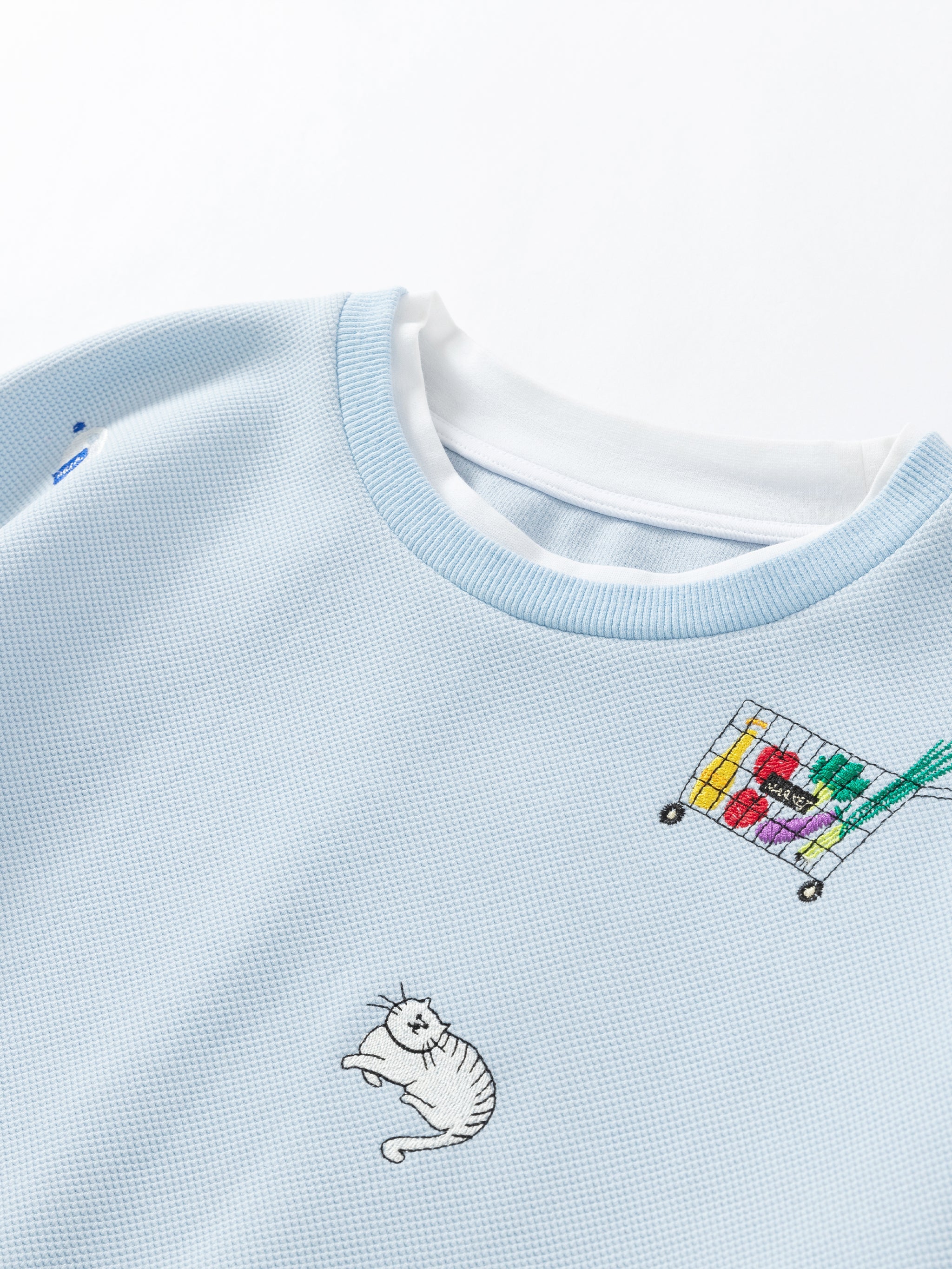- Il est teint dans la teinte bleu bébé la plus douce et brodé de nos illustrations emblématiques de nourriture et de chat Urlazh, parfait pour un look douillet et mignon.