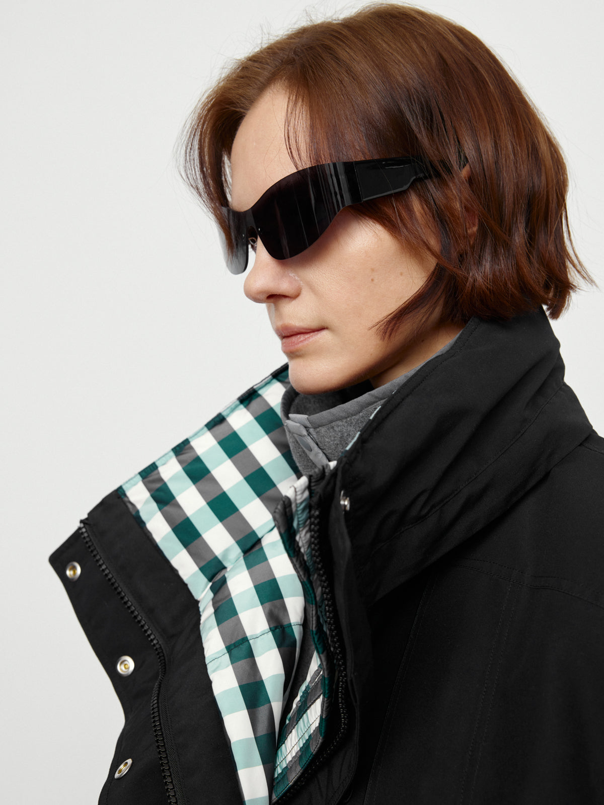 On one side, the classic black tone and the dividing line of the garment create a handsome atmosphere