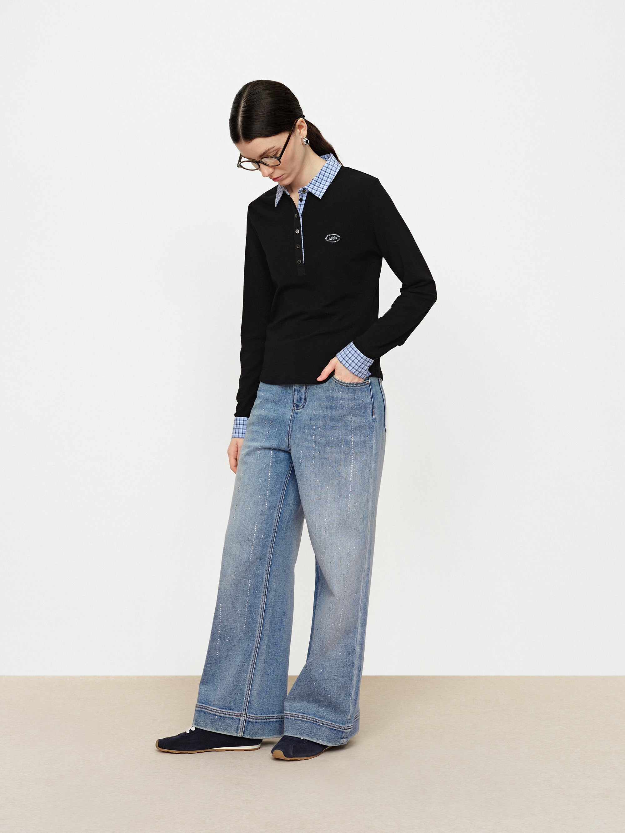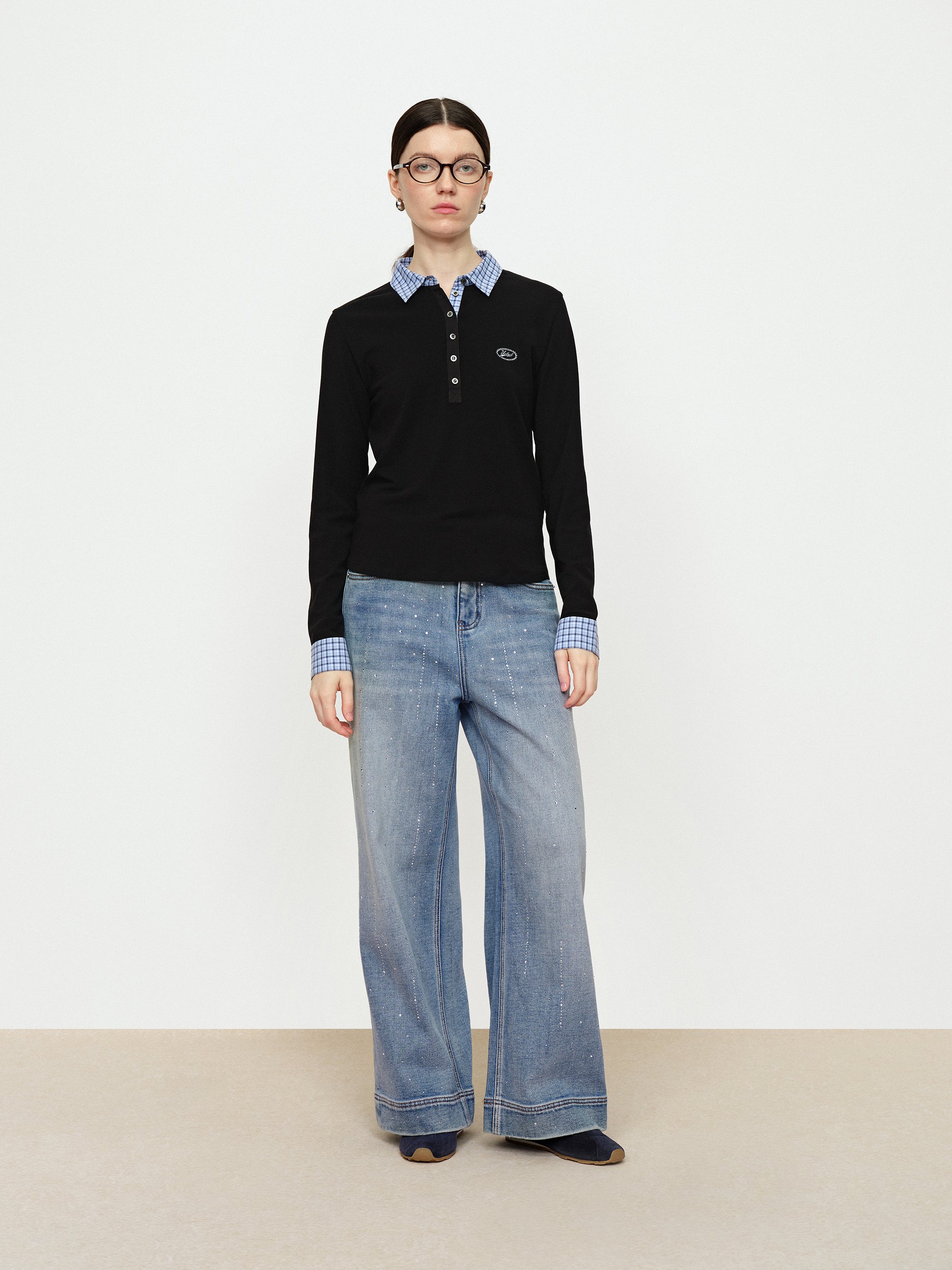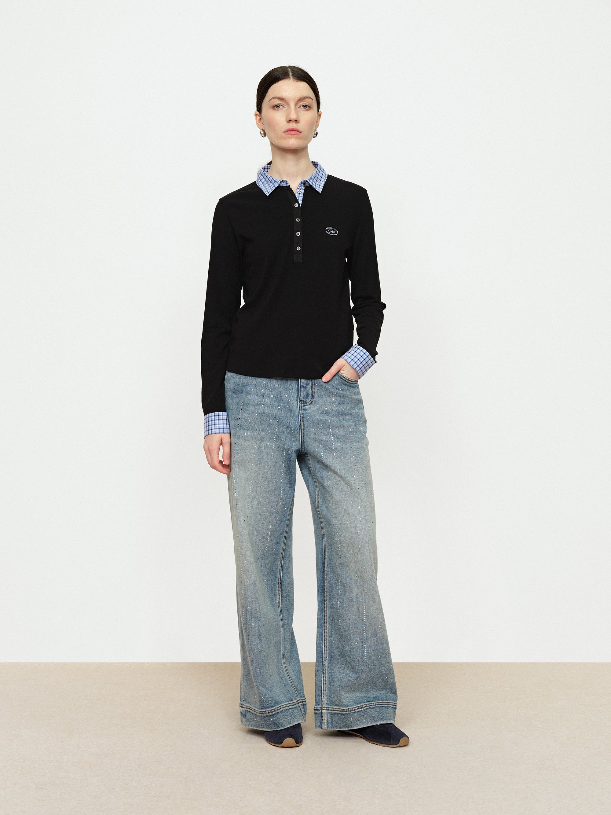 - Collar and cuffs are pieced together with a blue and white checkered shirt, injecting a vintage artistic atmosphere